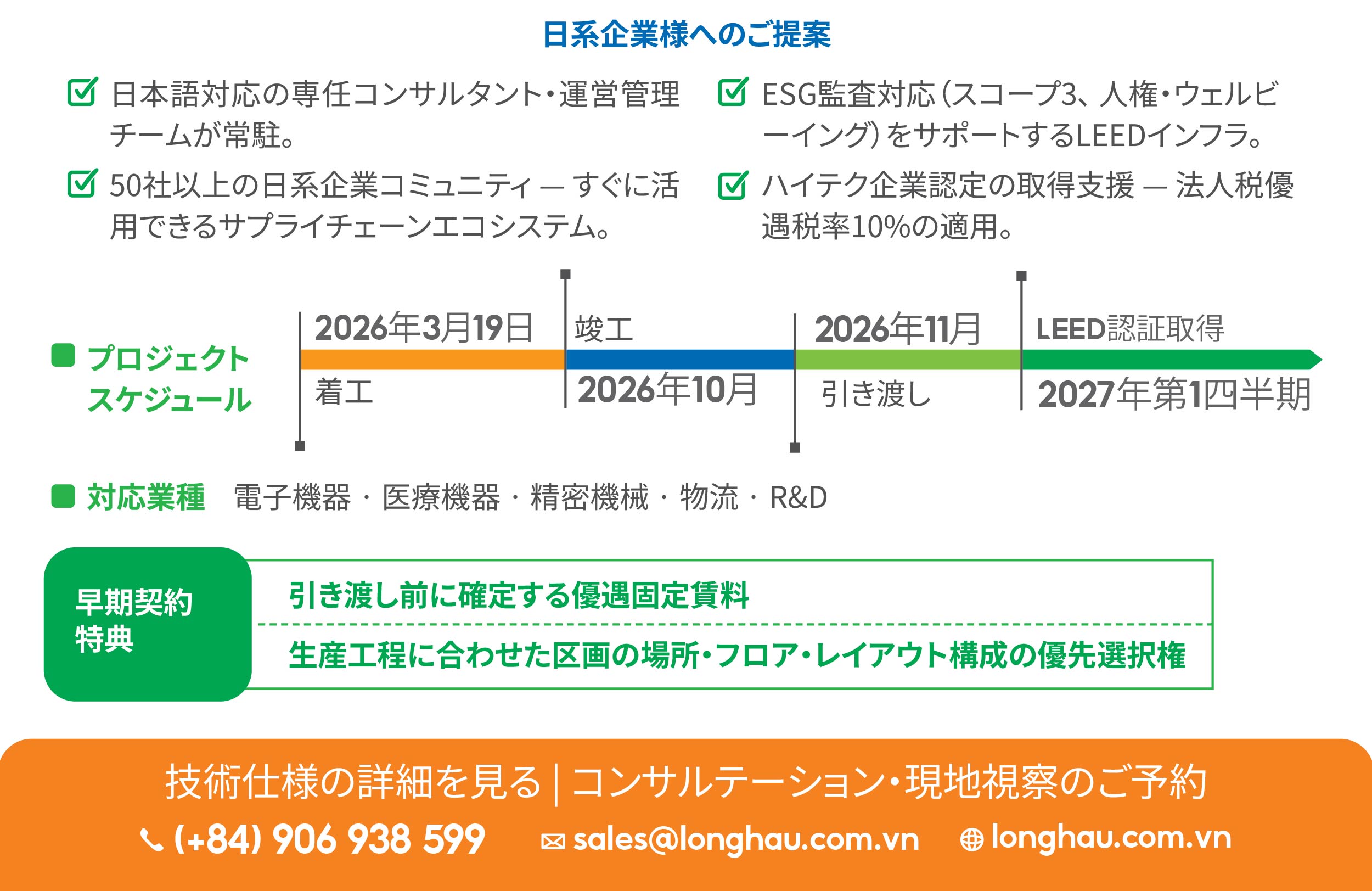 LONG HAU LEED PARKは、4階建てのハイブリッド型工場複合施設です。グローバルサプライチェーンの監査要件に初日から対応できるESG基準の操業環境を実現するために設計されております。