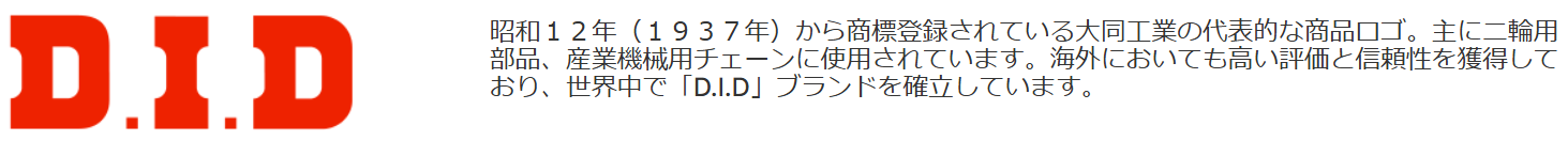 D.I.Dベトナム(大同工業100%出資会社)| D.I.Dブランドの高い信頼性と実績 DIDグループ(大同工業グループ)は、さまざまな産業向けに高品質なチェーン製品を提供する、チェーン製造の分野でのリーディング企業です。80年以上の経験を持つDIDグループは、産業、農業、その他多くの分野でのチェーンの製造および供給において確固たる信頼を築いてきました。 DIDベトナムはDIDグループの一員として、ベトナムでバイク用・自動車用タイミングチェーン(カムチェーン)、バイク用ドライブローラチェーン、産業用ローラチェーンの生産と販売を行っております。 DIDブランドとして生産・納入されるドライブチェーン(ローラーチェーン)やアルミリム等のバイク用製品は、国内・海外のメーカーやMotoGP等世界の名だたるレースにおいて長年にわたり採用され、高い評価と信頼を獲得しています。 国内外のメーカーや過酷なレースからフィードバックされる情報をノウハウとして最大限活用し開発・生産した製品を、DIDグローバルネットワークを通じて世界中の二輪車メーカーや愛好家へ供給しており、今やDIDブランドの製品は、高品質・高性能ブランドの証として、国内のみならず世界中のマーケットで絶大な信頼を獲得しています。