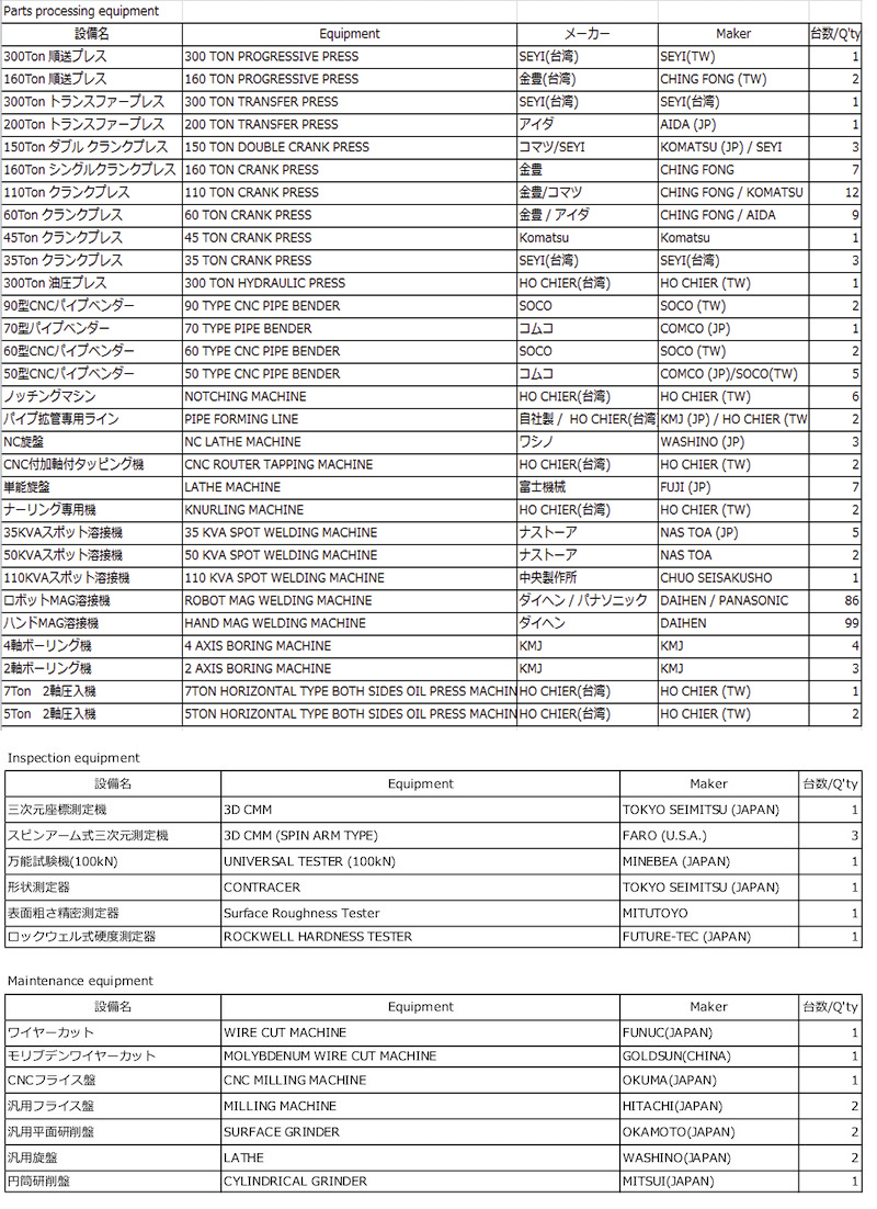 Welding Total 193 Units MAG Welding machine 86 Units, Spot welding machine 07 Units, Hand welding machine 99 Units